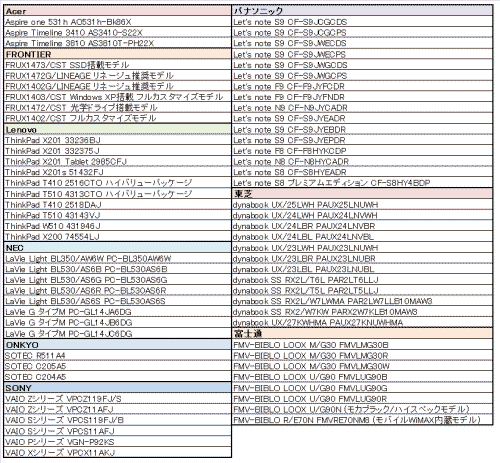 WiMAX内蔵パソコン一覧 ※クリックで拡大