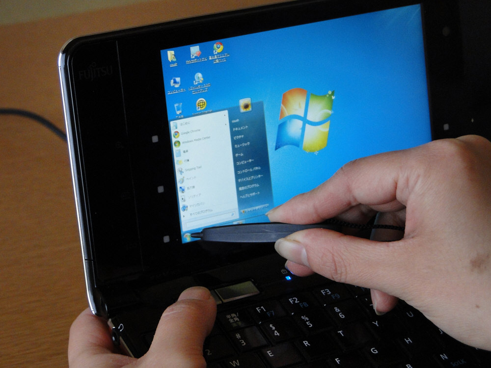 液晶にはマルチタッチのタッチパネルを搭載し、画面を直接タッチして操作する事も。またストラップタイプのスタイラスペンも付属し、手書き文字認識機能なども快適に使えます。さらに画面の横にはズームボタンやスクロールボタンなど、便利なボタンも配置されていました。