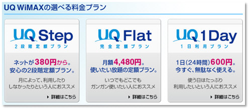 さらに、そんなにしょっちゅう使う訳じゃないしな…という場合には、「UQ 1Day」というプランも。必要な瞬間から24時間たった600円で、WiMAXが使い放題になるという超お手軽プランで、月に8日未満の使用頻度の場合に最適。しかも、毎月固定でかかる費用はゼロ。使用頻度の低い人には特に勧めたいプランです。