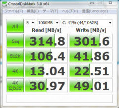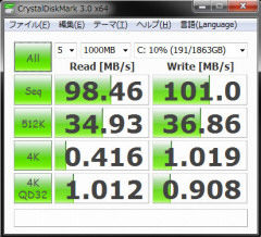 CrystalDiskMarkによる、ハードディスクのベンチマーク結果