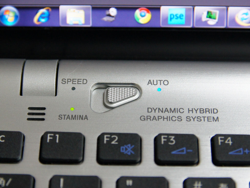右:GPUを切り替える珍しい三角形のスイッチ。全体的に質感が高い。