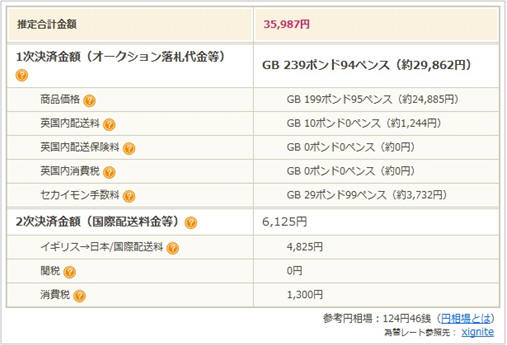 概算の総額見積もり本体価格は即決で約200ポンド(約24,885円)。そこにセカイモンの手数料約3,732円と、送料消費税約7,369円で、トータルの価格は約35,987円になるようです。
