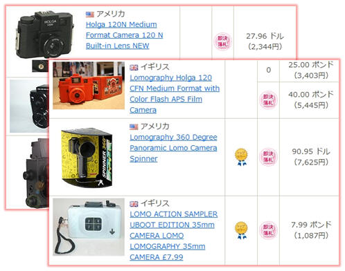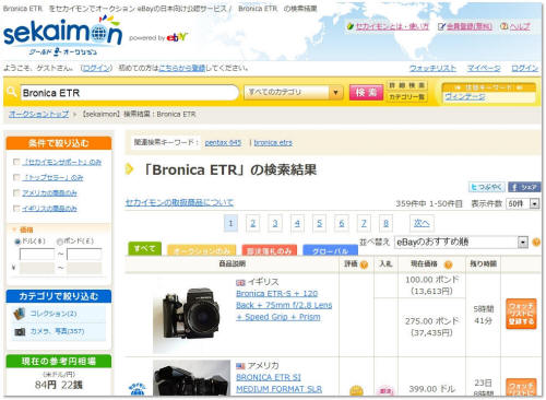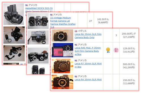 」で探してみると…おお、出てくる出てくる。国内に比べて出品点数も多く、消耗品やレンズも色々とあるようです。よく見るとアメリカの商品に加えてイギリスの商品まで検索対象に…いつの間にかイギリスのeBayも統合されているようです。