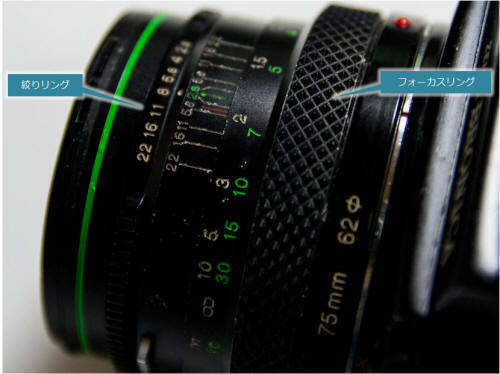 今時のデジカメは単焦点レンズだとフォーカスリング1つしかないものですが、このレンズにはリングが二つ。よく見るともう一つはF値(絞り)のリングで、現代は電子制御が一般的なもの。昔はここも手動だったんですね。