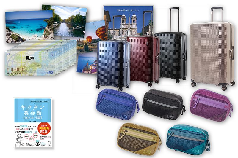 またサムソナイトのスーツケースや、H.I.S.の10万円分の商品券が当たるキャンペーンも行っています。もし当たったら、英語耳を鍛えて海外旅行に行くモチベーションになりそう!