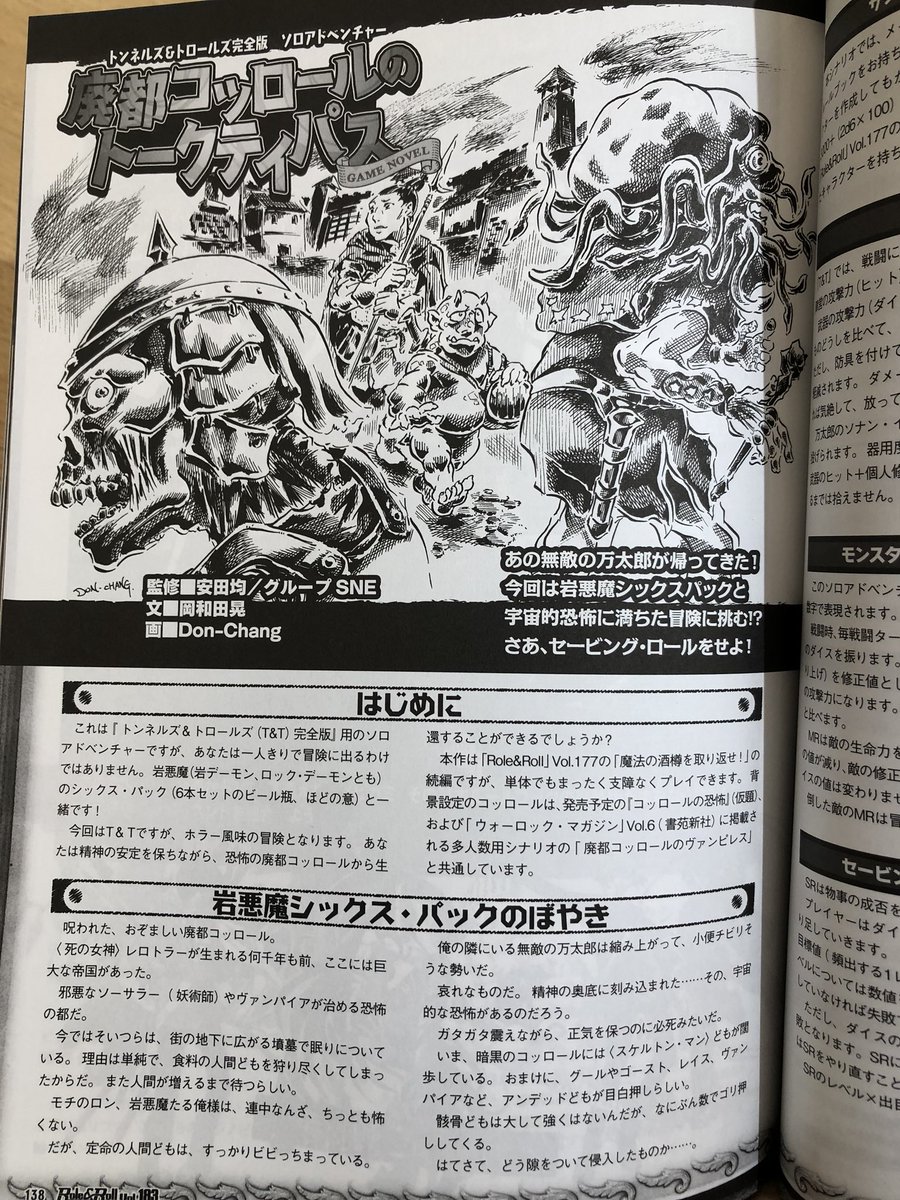 簡潔で力強い杉本=ヨハネ『旅人の丘を越えて』(FT書房)、元ネタ探しも楽しい岡和田晃『廃都コッロールのトークティパス』(ロール&ロール183)。かあかばあどさんも併せて、本邦T&Tソロアドも円熟の域に達した感があります。年明けウォーロック・マガジン(岡和田さん須永さん)にも期待! pic.twitter.com/7odkA89wFL