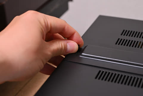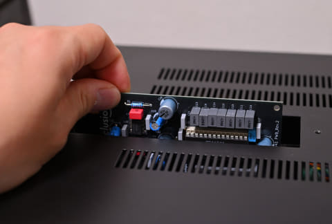 DACボードの交換は、天板にある2本の手回しネジを緩めてカバーを外し、手で引き抜く。手回しネジを緩めると自動で電源がオフになるので、電源の切り忘れは発生しない。DACボードを挿し込む時は、内部にガイドがあるので、それに沿って挿し込めばよい。