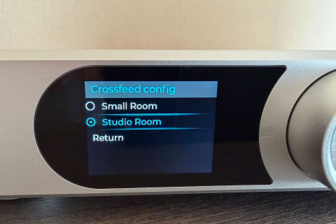 独自のクロスフィード技術「Convolutionモード」も試してみた。クロスフィードとは、LRチャンネルの信号を少しだけ混合することで、スピーカーで音楽を聴くような効果を実現できる。DSP設定メニューから「Crossfeed」を選び、Typeに「Convolution」を選択することで効果を発揮するというものだ。