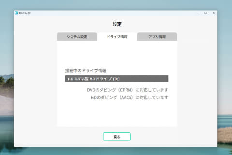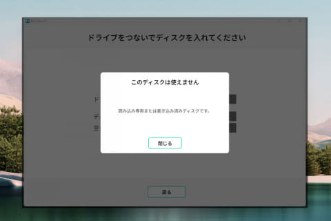 結果は、上記の通り。ソフトを立ち上げて「はじめる」をクリックすると、「このドライブはお使いいただけません。対応ドライブを接続してください」というアラートが表示されてしまった。現状は、アイ・オー・データ機器製のドライブでしか動いてくれないようだ。