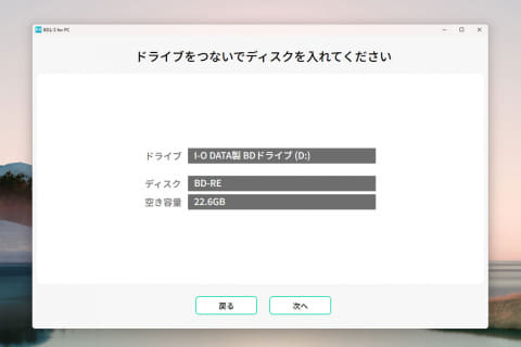 ロゴ下の「はじめる」をクリックし、表示に従ってドライブを接続、空のブルーレイディスクをセットする。今回は25GBのBD-RE(2倍速)とBD-R(6倍速)の2種類を使用した。