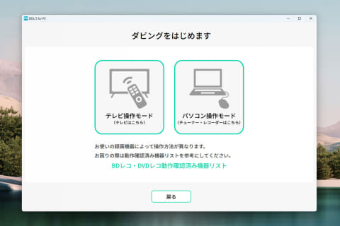 ディスクをセットして「次へ」を押すと、「テレビ操作モード」と「パソコン操作モード」を選択する画面が現れる。テレビの外付けハードディスクに入っている録画番組をダビングする際は前者、チューナーやネットワークHDDの録画番組をダビングする際は後者を選ぶ。
