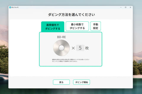 画質を落とさず録画した時の品質のままディスクに焼きたい時は「画質優先」、画質を落としてでも1枚のディスクにまとめたい時は「最小枚数」、映像モードを自身で選びたい時は「手動設定」を選ぶ。方法の選択後、ダビングが開始される。