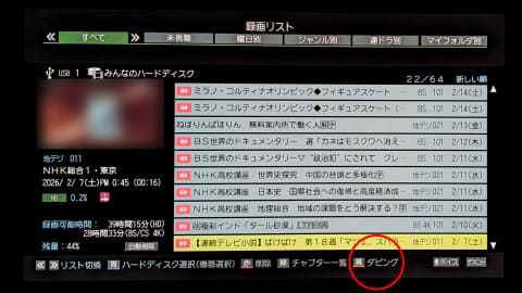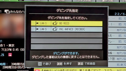 前置きが長くなってしまったが、実際に自宅のテレビ(2020年モデルのレグザ「X9400」)と、ネットワークHDD(RECBOX)の中にある録画番組をBDレコでダビングしてみた。
