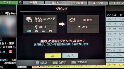 ダビング先指定を「BD RECO」にして決定ボタンを押すと、ダビング実行の確認画面になる。「はい」を選択すれば、レグザからPC(BDレコ)への番組転送がスタートする。