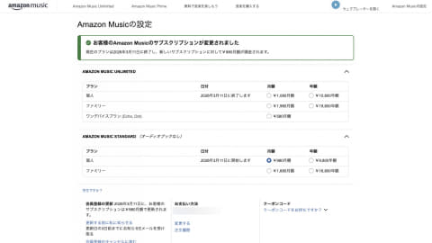 プランの切り替えは、「」ページから行なえる。登録したいプランの月額と年額の欄にある丸いマークをクリックすれば完了だ。このAmazon Musicの設定ページは、PCのブラウザでAmazon musicのページを開いたときに右上に項目が出ているほか、ヘルプページのリンクから遷移できる。