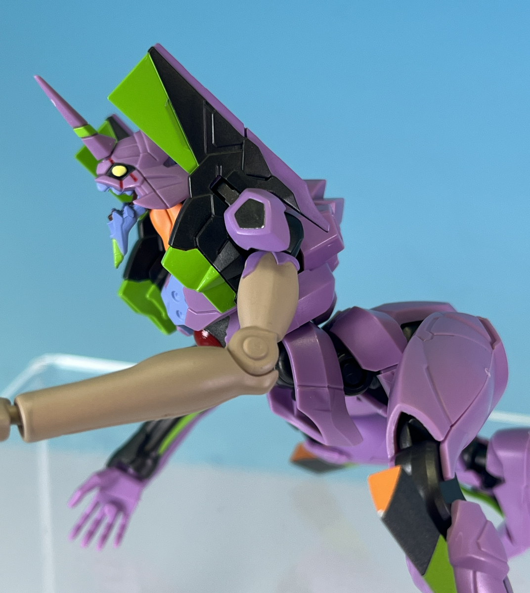今回の初号機はアニメ設定に合わせた紫色の体色と鮮やかな黄緑色のラインを艶ありで仕上げています。