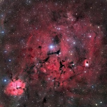 ふたご座のクラゲ星雲 IC443付近(SHO合成) 2026年01月26日 16:12 好天続きなのでふたご座のクラゲ星雲IC443付近を二晩にわたり撮りました。SII 672.4nm、Hα 656.3nm、OIII 500.7nmの各波長近傍のごく狭い範囲(FWHMで5nm)の光だけを通すfilterを使ったSHO合成で、星は通常のRGBで撮ったものに置き換えています。ここのHαとSII強度は強 ...
