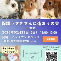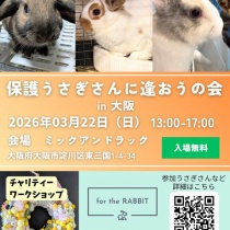 保護うさぎ譲渡会 第34回 保護うさぎさんに逢おうの会in大阪【3/22】 2026年03月11日 20:00 今回は、3月22日開催の『保護うさぎさんに逢おうの会 in 大阪』のお知らせです。 毎月定例の大阪会場では、今回もうさぎ専門店 Mick and Luck(ミックアンドラック)さんが会場をご提供くださいます。 そして今回は、約1年ぶりにエントリー制での開催となります。 本記事内に ...