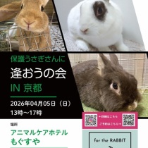 保護うさぎ譲渡会 保護うさぎさんに逢おうの会in京都【4/5】 2026年03月16日 20:00 京都で2回目の開催となる『保護うさぎに逢おうの会 in 京都』のお知らせです。 for the RABBITでは、大阪では毎月、神戸では季節ごとに譲渡会を開催しています。 京都会場の譲渡会はまだ2回目と始まったばかりですが、 これから少しずつ、京都でも保護うさぎたちとのご縁をつ ...