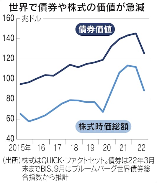 世界の債券や株式の価値が急減している。2022年4~9月には合計44兆ドル(約6300兆円)消失し、半期ベースで過去最大となった。歴史的な金利の急上昇を震源とした証券価値の減少が、英国の年金基金など思わぬところに危機の芽を生み出している。