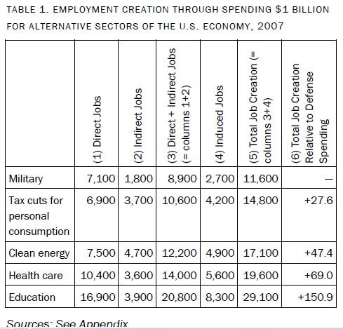 一つは、「多額の国防支出は失業につながる(Massive Defense Spending Leads to Job Loss)」と題されたディーン・ベーカーの小論(11/11エントリ)。それによると、ベーカー率いるCEPRがかつてグローバルインサイト社(旧Data Resources Inc.)に委託して行なった研究では、以下のような結果が出たという。