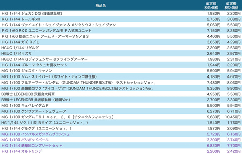 この他、7月~9月に再販する商品では、ガンプラ「HG 1/144 ガンダム G-ルシファー」(2,200円→2,750円)、「HGUC 1/144 ガブスレイ」(1,760円→1,980円)、「PG 1/60 RX-0 ユニコーンガンダム」(22,000円→24,200円)などの価格を改定する。