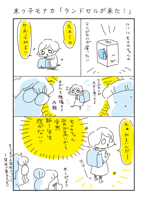 末っ子モナカ「ランドセルが来た!」 2025年01月21日 ********登場人物********我が家は私(アベナオミ)と3歳年上の夫長男豆キチ(15歳 中学3年生) 霊感強い 次男アンチョビ(9歳 小学3年生)大食い 長女モナカ(6歳 幼稚園年長)体力オバケ5人家族の日常をお届けいたします。*********** ... 続きを読む