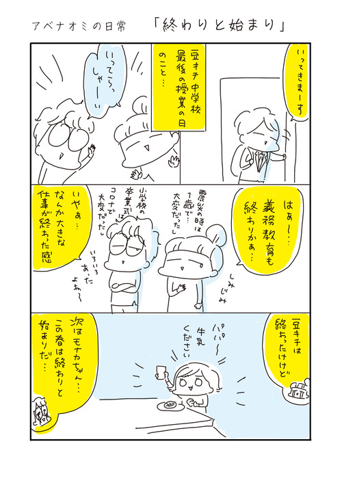 アベナオミの日常「終わりと始まり」 2025年03月12日 ********登場人物********我が家は私(アベナオミ)と3歳年上の夫長男豆キチ(15歳 中学3年生) 霊感強い 次男アンチョビ(9歳 小学3年生)大食い 長女モナカ(6歳 幼稚園年長)体力オバケ5人家族の日常をお届けいたします。*********** ... 続きを読む