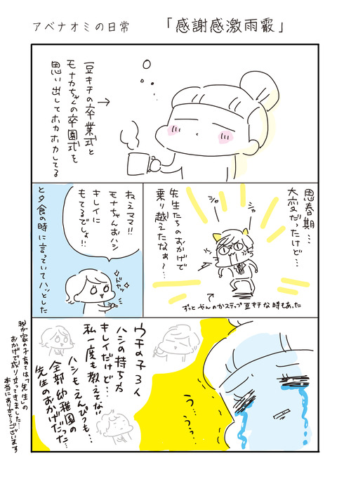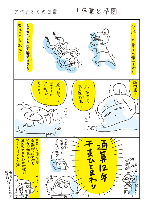 アベナオミの日常「卒業と卒園」 2025年03月17日 ********登場人物********我が家は私(アベナオミ)と3歳年上の夫長男豆キチ(15歳 中学3年生) 霊感強い 次男アンチョビ(9歳 小学3年生)大食い 長女モナカ(6歳 幼稚園年長)体力オバケ5人家族の日常をお届けいたします。*********** ... 続きを読む