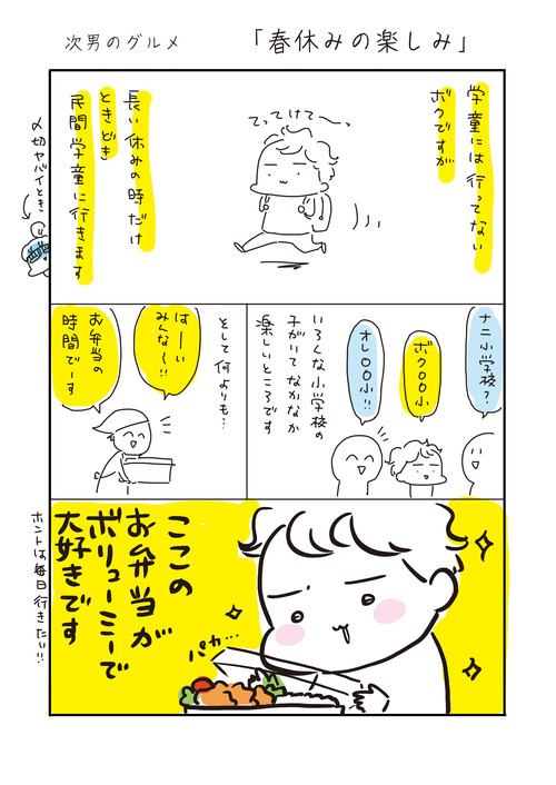 次男のグルメ「春休みの楽しみ」 2025年04月07日 ********登場人物********我が家は私(アベナオミ)と3歳年上の夫長男豆キチ(15歳 高校1年生) 霊感つよつよ男子 次男アンチョビ(9歳 小学4年生)大食い男子 長女モナカ(6歳 小学1年生)体力オバケ5人家族の日常をお届けいたします。****** ... 続きを読む