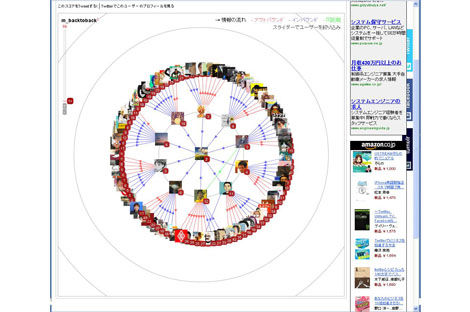 自分のTwitterアカウントでこのサービスにログインすると、RTされた自分のつぶやき一覧とともに、「ReTweetレーダー」と呼ばれる情報の流れを可視化した図を見ることができる。