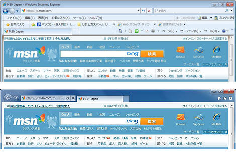 | 上がIE8、下がIE9のツールバー。IE9のツールバーは幅が狭くなったぶん、一度に表示できる情報量が増えた。 |