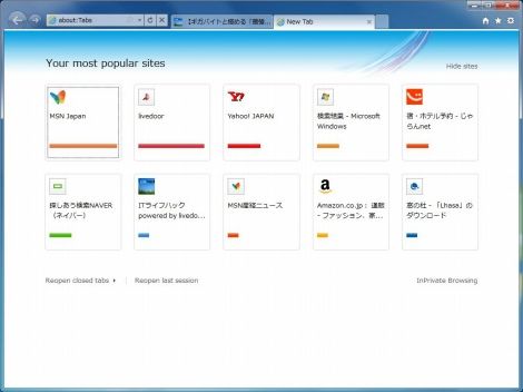 | IE9では、「新しいタブ」を作成すると、よく利用するサイトがアイコン付で最大10個まで一覧表示される。 |
