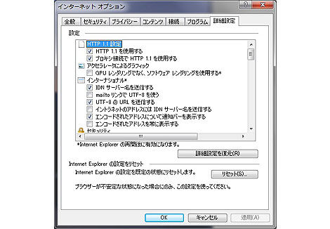 GPUを有効化するには、IE9を起動後、「Alt」キーを押して「インターネットオプション」を選択する。「詳細設定」タブの「アクセラレータによるグラフィック」「GPUレンダリング」の項目があるので、「GPUレンダリングでなく、ソフトウェア レンダリングを使用する」のチェックが付いていたら、そのチェックを外しておこう。