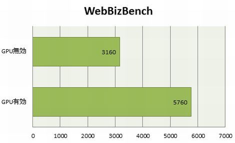 今回は1366×873ピクセルの解像度でテストを実行した。GPUを有効にした場合は5760(27.21fps)であるのに対して、無効にした場合は3160(6.94fps)だった。1秒間あたり、どれくらいのフレームを描画できるかを表している。