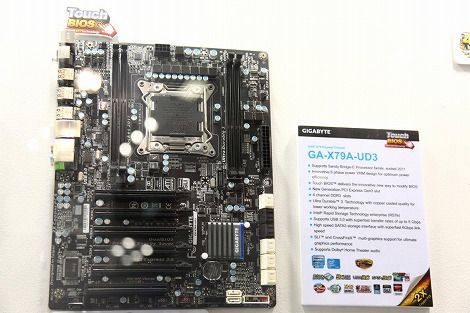 10月~11月に日本で解禁されると噂されているX79チップセット搭載のマザーボードも展示されていた。