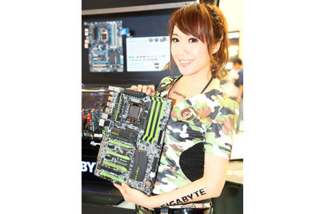 イベントで新製品と同じくらい楽しみなのは、ブースを彩るショーガールだろう。GIGABYTEブースでは、同社のマザーボードにちなんだコスチュームのショーガールを何名か見掛けたので、ここで紹介しよう。