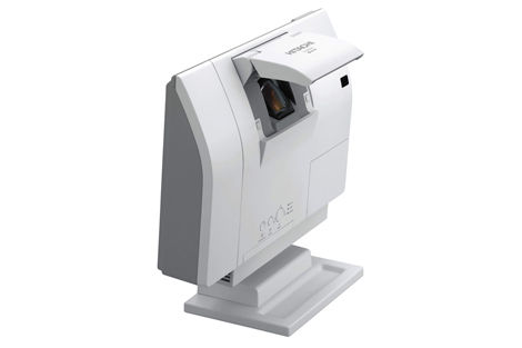 日立の「CP-A301NJ」、「CP-A251NJ」は、通常のプロジェクター同様に、スクリーンや壁などに投影できるほか、オプションの机上投影スタンドを利用すると、机上にプロジェクターを置いたまま、その机上に映像を投影できる。短距離で大画面を投影できるというのが特徴だ。