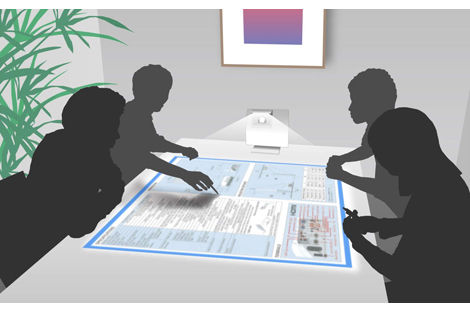 プロジェクターを利用した会議というと、どうしても一定以上のスペースを必要とするが、同機種を利用すると、机上にプロジェクトを置き、その机上に映像を表示できる。