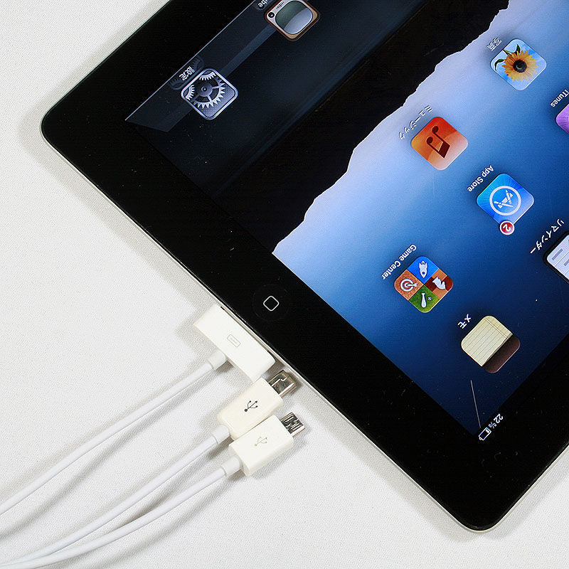 写真を見てもらえばわかるがUSBコネクター(USB Aオス)が元になっており、そこから3つのケーブルが延びて、スマートフォンなどで使われるmicroUSBコネクター、ポータブルHDDなどで使われるminiUSBコネクター、iPhoneやiPadで使える30ピンコネクターの全部で3つではないかと思うだろう。実は、ここがこのコネクタのグッドアイディアなところなのだ。このケーブルの30ピンコネクターは、180度ひっくり返して使うことでGalaxyTabにも充電することができるようになっているのだ。コロンブスもビックリなナイスな仕掛けだ。