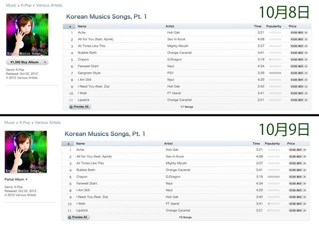 | 2012年10月8日には7曲目にあったが翌日には消えていた。 |