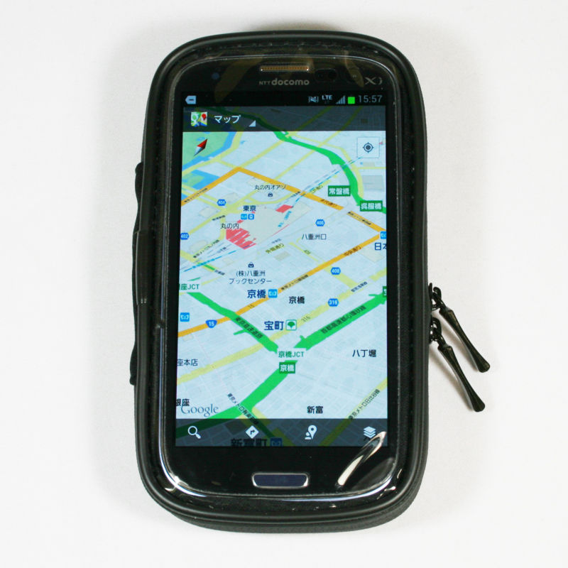 この製品は、スマートフォンを入れるケース部分と自転車のハンドルに固定するマウントがセットになった製品だ。ケースの上部は透明なカバーになっており、カバーに入れた状態でもタッチ操作が行えるようになっている。カバーを開閉するためのファスナーは、水が浸入しにくいきめ細かい止水ファスナーになっているので、多少の雨でも水が浸入しにくくなっているのがうれしい。iPhone 5やGALAXY SIIIといった前モデルと比べて大型化したモデルでも、余裕で入れることが可能だ。具体的には71(幅)mm×137(高さ)mm×13(厚さ)mmまでのスマートフォンであれば、このケースに入れることができるようになっている。
