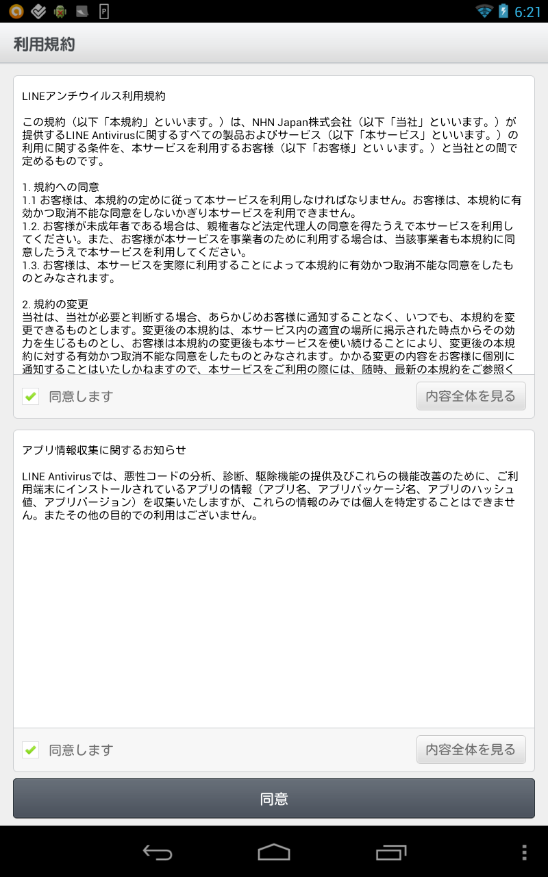 LINEアンチウイルスは、システムのかなり奥のほうまでチェックする。たとえばLINEやSkype、Messengerといったアプリは、ユーザーデーターにアクセスすることで、つながりを検索して、フレンドと推測されるユーザーを提示してくれる機能を持っている。LINEアンチウイルスは、こうした個人情報にアクセスするのと同時に通信を行うアプリを監視する。そのためインストールされているアプリの情報も収集する。まず「LINEアンチウイルスの利用に関する規約」と「端末内の情報収集」に「同意」しないとアプリが実行できないようになっている。