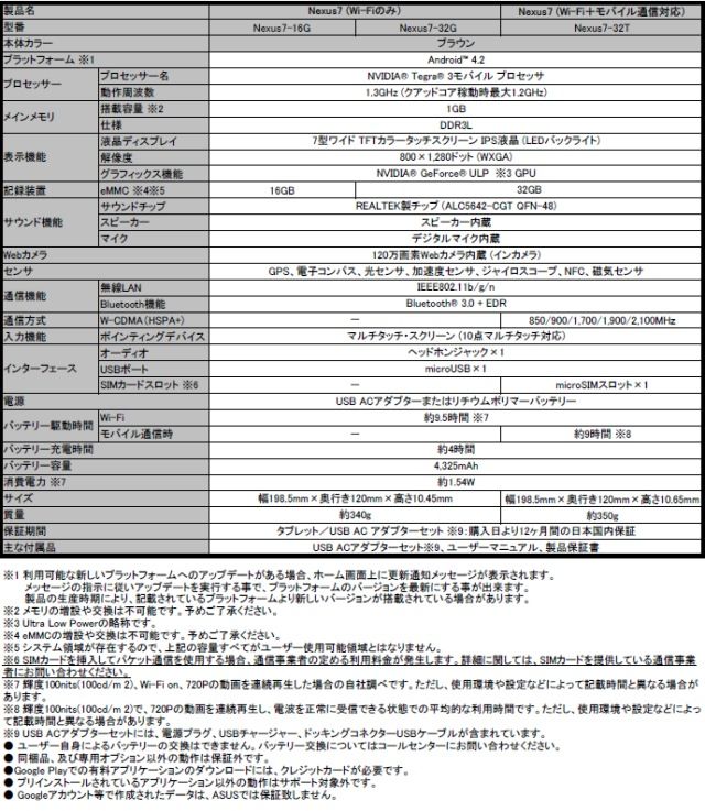 ・製品名:Nexus 7(Wi-Fi+モバイル通信対応)