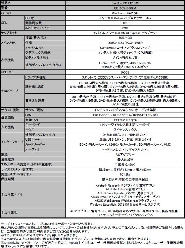 ■「ASUS EeeBox PC EB1505-B002M」スペック詳細