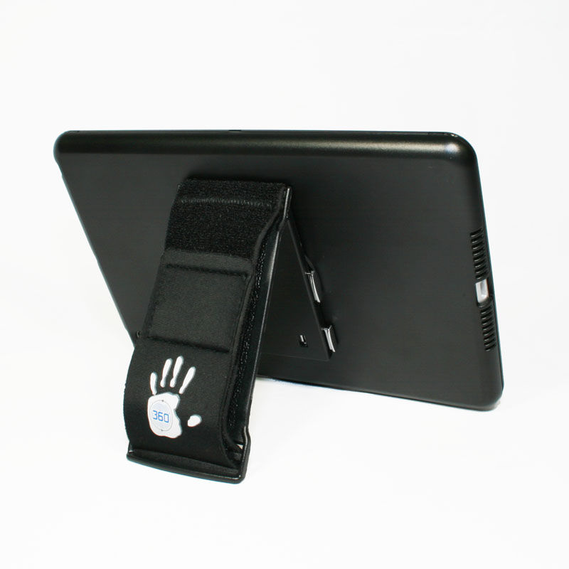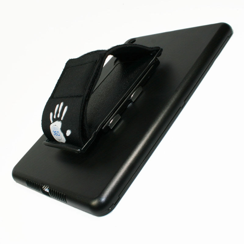 この製品、冒頭の写真のように指を伸ばした状態で手のひらにピタッと張り付いたように見える。なぜそのように見えるのかは、反対側から見るとわかる。手を入れて固定できるハンドストラップが付いているためだ。しかもこのハンドストラップは回転するので、タテ表示だけでなくヨコ表示でも手可能なので、タテヨコ関係なく利用できるようになっている。