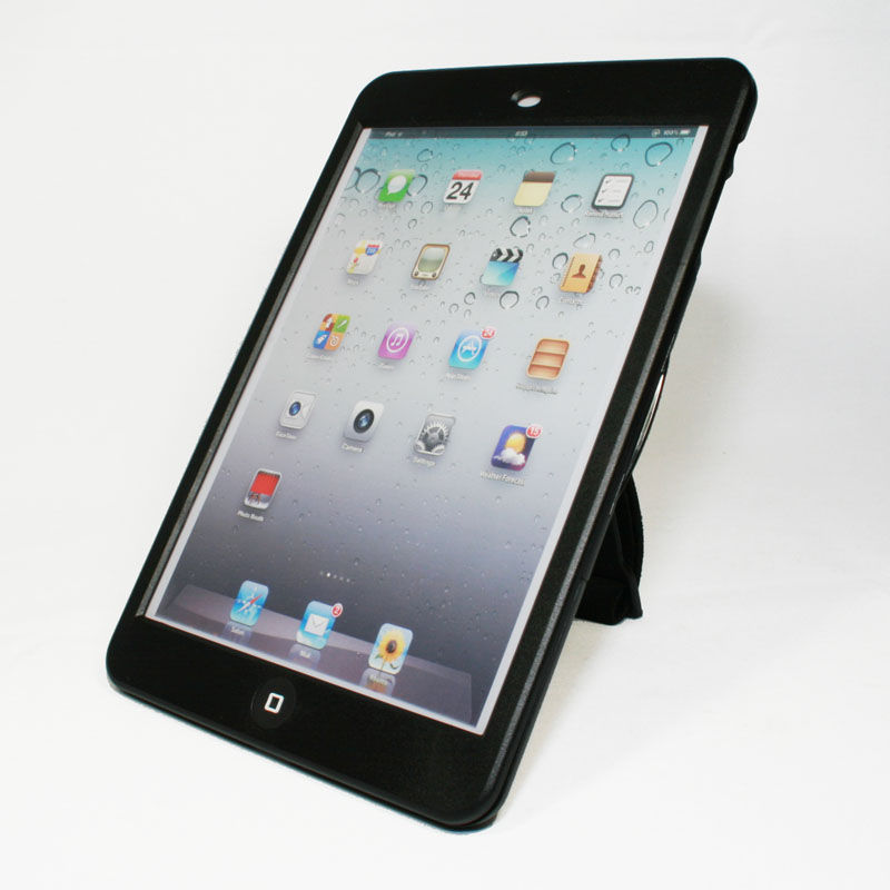 この製品は、iPad mini用のケースと、そのケースの背面部分に装着するハンドストラップ(兼スタンド)という構成だ。このケースは、iPad mini本体を丸ごと包み込むタイプなので、ケースに入れている感じがしないのがポイントだ。色はホワイトとブラックが用意されており、本体の色と同じにして選んでもいいし、本体の色とは逆を選んで、気分でホワイトをブラック、ブラックをホワイトにすることもできる。