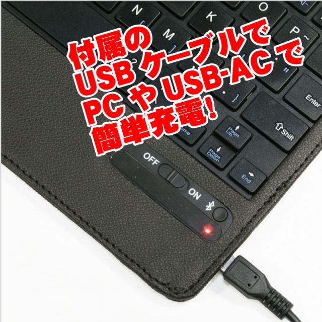 iPad miniとキーボードはBluetooth接続で利用する。そのためキーボード側にも電源が必要となる。キーボードは充電式なので乾電池などの消耗品は不要だ。充電も付属のUSBケーブルを利用してACアダプタやPCから簡単に充電することができる。