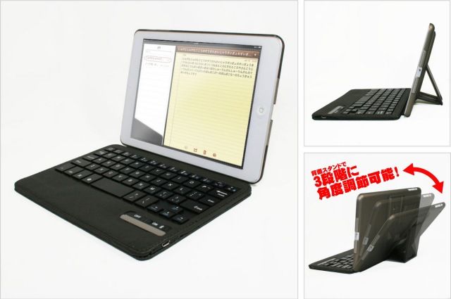 本製品は、背面にスタンドが装備された本体カバーとBluetoothキーボードが搭載されたカバーの2つからなる製品だ。カバーにiPad miniをセットして、デスクで液晶を開けば、だれが見ても超小型のパソコンそのものだ。ケースの背面にはスタンドが装備されており、3段階の角度調整も可能だ。この手の製品では、一般的なパソコンとは異なり、iPad mini(画面)側に重心があるため、しっかりしたスタンドで角度調整ができるのはうれしい点だ。