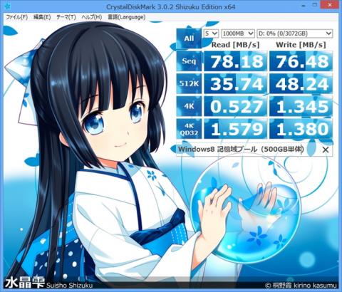 WD5000AACSをWindows 8の記憶域プール機能で使用したときのベンチマークは、下記のとおり。